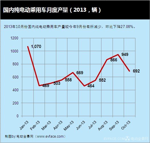 2013年10月份國內純電動乘用車產量692輛,較今年9月份產量有所減少,環比下降27.08%,與去年10月份相比,同比下降40.41%。