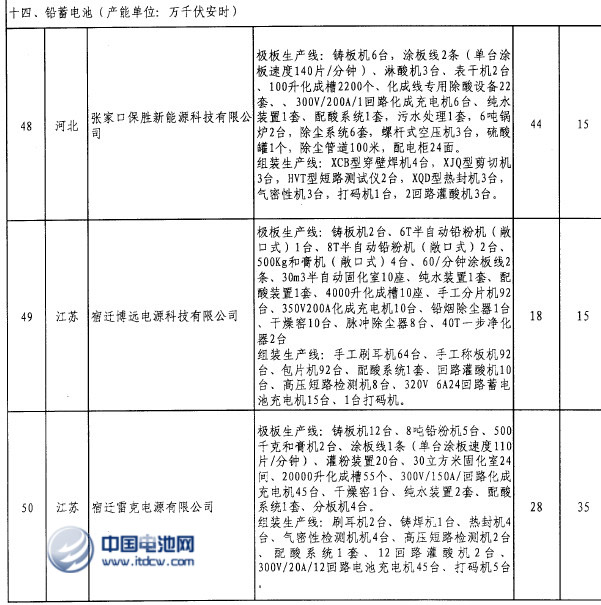 中國電池雜志-中國電池網9月17日訊(肖何 北京報道)工信部網站發布2013年第46號公告2013年第三批工業行業淘汰落后產能企業名單,鉛蓄電池行業有11家赫然上榜,分別是張家口保勝新能源科技有限公司、宿遷博遠電源科技有限公司、宿遷雷克電源有限公司、江蘇永達電源股份有限公司、天能電池集團有限公司、紹興白天鵝電動自行車有限公司、泗縣惠豐電源有限公司、江西省華輝電源科技有限公司、萍鄉市強鑫蓄電池有限公司、駱駝集團股份有限公司、福建省閩華電源股份有限公司(安溪縣),其中極板生產線(設備)629條,組裝生產線(設備)311條。