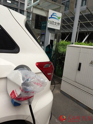 在海淀區(qū)清華科技園充電站,車主怕雨天存在安全隱患,給愛車的充電接口套上了塑料袋。
