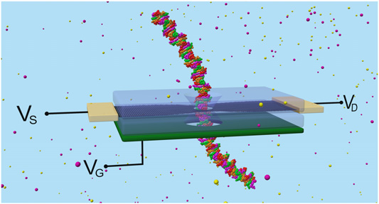 研究人員設(shè)計的DNA感測器是一種以石墨烯為基礎(chǔ)的場效應(yīng)類晶體管設(shè)備,能探測DNA鏈的旋轉(zhuǎn)和位置結(jié)構(gòu)。實(shí)現(xiàn)這一點(diǎn)的關(guān)鍵是利用了石墨烯的電學(xué)性質(zhì),制成的GNR可以多方調(diào)節(jié),改變它的邊緣形狀、載流子濃度、納米孔位置等,由此來調(diào)節(jié)它的電導(dǎo)率和對外部電荷的靈敏度。
