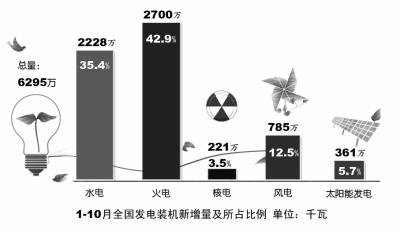 消息稱,1-10月,全國累計新增新能源和可再生能源發電裝機3595萬千瓦,為去年同期的2倍,占新增發電裝機57.1%,占比比去年同期提高19.5個百分點。