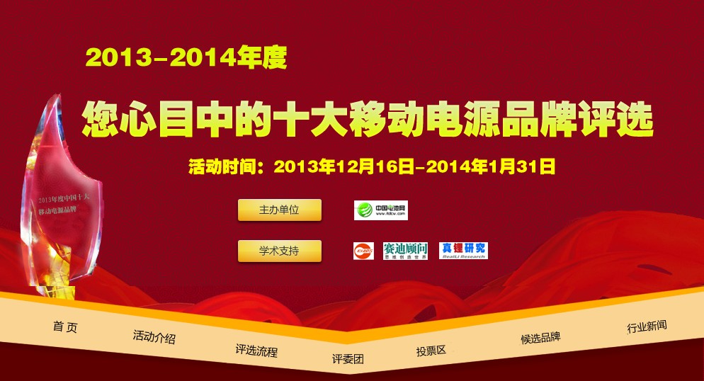 中國電池網推出“2013年度您心目中的十大移動電源品牌評選活動”旨在盤點分析行業、推舉最受消費者歡迎的有品牌意識、產品責任和社會責任感的公司或品牌,倡導理性、明白消費。活動在公眾投票結束、專家評點(2013年12月16日-2014年1月31日)后,推選出移動電源行業十大品牌,并頒發證書和獎杯,同時將召開移動電源行業論壇,邀請行業協會領導、行業專家、主流移動電源品牌及上下游公司出席頒獎論壇,同時獨家發布2013-2014年度移動電源行業市場調研與分析報告。