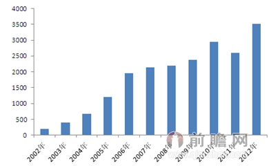 2002-2012年中國電動(dòng)自行車產(chǎn)量變化趨勢圖(單位:萬輛)