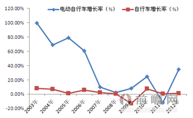 2003-2012年中國電動(dòng)自行車與自行車產(chǎn)量增速趨勢圖(單位:%)