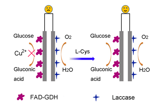 生物燃料電池利用酶或產(chǎn)電微生物為生物催化劑,通過(guò)電化學(xué)途徑把生物質(zhì)燃料中的化學(xué)能直接轉(zhuǎn)化為電能,從而提供清潔的能源。此前,生物傳感技術(shù)團(tuán)隊(duì)已經(jīng)開(kāi)發(fā)出一系列基于微生物表面展示酶的高性能生物燃料電池(L. Xia, et al., Biosensors & Bioelectronics 2013, 44, 160–163; Q. Lang, et al., Biosensors & Bioelectronics 2014, 51, 158–163; C. Hou, et al., Analytical Chemistry 2014, 86, 6057–6063.)。近日,該團(tuán)隊(duì)博士后侯傳濤等人分別以黃素腺嘌呤二核苷酸型葡萄糖脫氫酶(FAD-GDH)和漆酶(laccase)制備生物陽(yáng)極和生物陰極,構(gòu)筑了高性能的葡萄糖/氧氣生物燃料電池,最大輸出功率密度98 μW cm-2,開(kāi)路電位高達(dá)0.78 V。進(jìn)一步研究發(fā)現(xiàn),Cu2+可以明顯抑制該燃料電池的開(kāi)路電位,而L-半胱氨酸(L-Cys)通過(guò)與Cu2+作用形成Cu-S鍵,能夠除去電極表面的Cu2+,從而有效地恢復(fù)燃料電池的開(kāi)路電位。利用該原理設(shè)計(jì)開(kāi)發(fā)了自供電的L-半胱氨酸傳感器(如圖)。