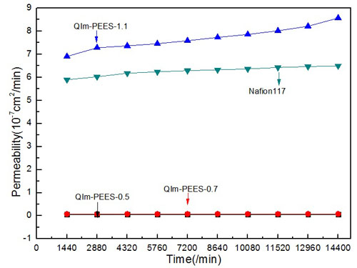 Nafion117和QIm-PEES-AEMs在25℃下的釩離子(Ⅳ)滲透率(10天)