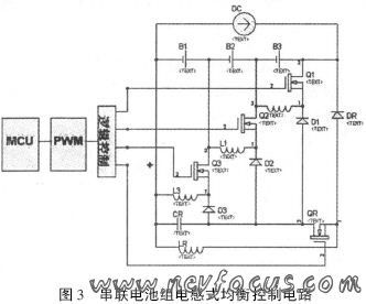 系統中, 及時檢測電池組中各電池的狀態信息, 送入MCU 中, 通過算法處理, 控制PWM的輸出, 驅動開關器件的導通和關斷. 當某個電池電壓較高時, 相應的開關器件導通, 電池將能量儲存到相應的電感中, 當開關斷開后, 能量轉移到下游的電池, 多余能量轉移到公共電容上并回饋給充電電路。
