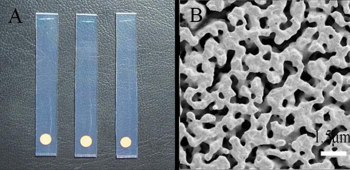 圖1.三維多孔結(jié)構(gòu)金膜的照片。(A)金膜在FTO上的光學(xué)照片;(B)金膜的掃描電鏡照片。