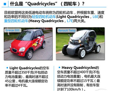 據(jù)歐盟規(guī)定,輕型四輪機(jī)動車的空車質(zhì)量不超過350千克(不包括動力電池重量),最高時速不超過45公里,電機(jī)最大連續(xù)額定功率不超過4千瓦;而重型四輪機(jī)動車的空車質(zhì)量不超過400千克(不包括動力電池重量),電機(jī)最大連續(xù)額定功率不超過15千瓦(最高時速并沒有限制,有些達(dá)到了100km/h)。