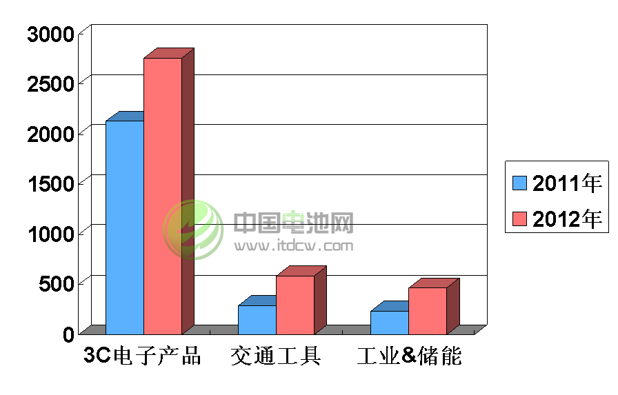 2012年全球動力鋰離子電池市場增長總量527.12萬kWh,雖然與3C小電池還有近100萬kWh的差距,但增長速度(近100%)遠高于小電池(不到30%);交通工具各細分市場呈現全面增長態勢,工業&儲能市場目前還主要依賴電動工具,但智能電網儲能和移動基站電源市場增長很快。