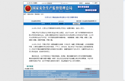 據國家安監局網站事故信息顯示,2013年11月6日,江西九江天賜高新材料有限公司發生一起爆炸事故,造成3人死亡。天賜公司位于江西省九江市湖口縣金沙灣工業園區,成立于2008年,是廣州天賜投資的獨資企業,主要從事鋰電池和動力電池材料及日化用品等化工材料的生產經營,2011年7月28日取得安全生產許可證,許可范圍包括聚丙烯酸樹脂、六氟磷酸鋰、碳酸二甲酯、碳酸二乙酯、碳酸乙烯酯、碳酸丙烯酯、丙酸乙酯。