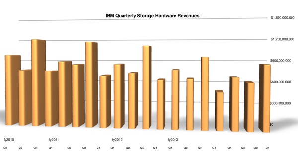 IBM最新季度報表和全年財政結(jié)果顯示,在2014年度存儲硬件業(yè)務(wù)營收衰減之勢并沒有停止。2014年第四季度營收下滑8個百分點(diǎn),8.64億美元。