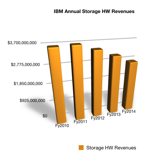 四年來存儲硬件營收經(jīng)歷了從10年的36.8億美元到11年34億美元,再到12年的30億美元,最后到了2014財年26.9億美元。