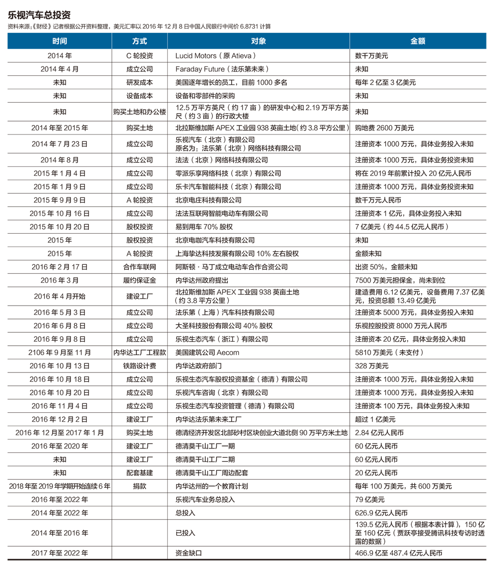 他在專訪中透露,樂視汽車業(yè)務已投入“一百五六十億”,而要實現(xiàn)量產(chǎn),總投入“至少也得400億到500億元”。這就是說,樂視還需要投入240億到350億元到汽車業(yè)務。而按照《財經(jīng)》記者的統(tǒng)計,資金缺口在460億元以上(見附表:樂視汽車總投資)。
