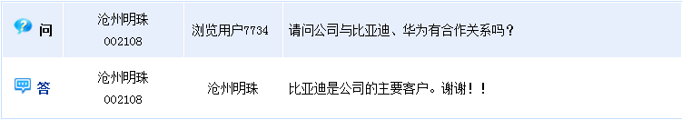 滄州明珠(002108)周二在全景網(wǎng)互動(dòng)平臺(tái)上介紹稱,比亞迪是公司的主要客戶。