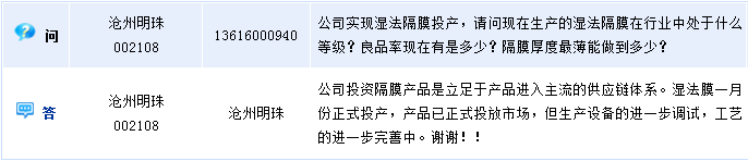 滄州明珠(002108)周二晚間在全景網(wǎng)互動(dòng)平臺(tái)上介紹稱,濕法膜一月份正式投產(chǎn),產(chǎn)品已正式投放市場(chǎng),但生產(chǎn)設(shè)備還在進(jìn)一步調(diào)試、工藝進(jìn)一步完善中。