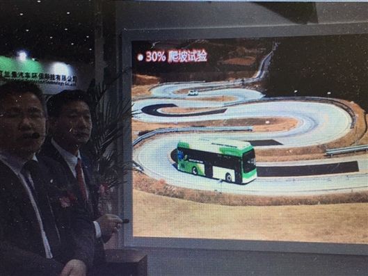 記者在現(xiàn)場(chǎng)看到:從正在放映的電視中記者看到更為驚險(xiǎn)、精彩的畫面:只見一臺(tái)大客車固定在側(cè)翻試驗(yàn)臺(tái)上,隨著側(cè)翻角度加大,隨著一聲轟鳴整車隨即側(cè)翻在地面,只見所有玻璃破碎,然而車身未見任何扭曲、撕裂及變形,特別是裝在該車頂部200kWh近兩噸重的電池及箱體不僅完好無損,仍牢牢固定在車頂頂部,在場(chǎng)所有人員發(fā)出驚嘆的呼聲。而在現(xiàn)場(chǎng)一位工作人員正輪著大錘猛砸一塊制造電動(dòng)客車的車身的材料,砸后沒有變形破裂。