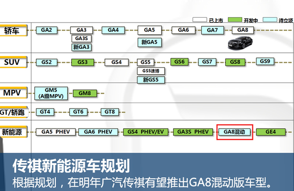 廣汽傳祺目前在售的新能源車僅有GA5 PHEV一款車型?!鞍l展新能源汽車是廣汽未來的核心戰略,也是傳祺品牌的重中之重”。吳松透露:“目前,第一階段我們的重點是在PHEV方面,同時兼顧開發純電;第二階段重點是純電,混合動力只是針對某些特定車型、高端車型?!逼渲谢贕A8打造的新能源車型就將采用混合動力形式,預計明年投放市場。