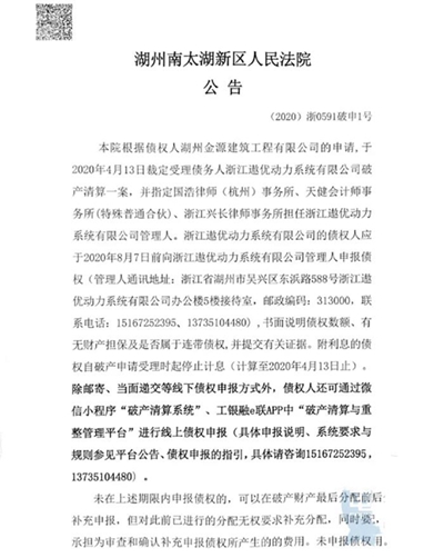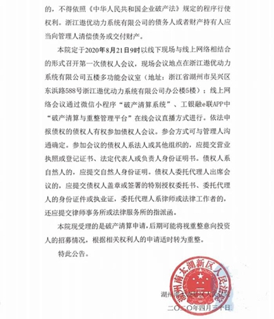 隨后,遨優(yōu)動(dòng)力的狀況急轉(zhuǎn)直下。法院公告稱,根據(jù)債權(quán)人湖州金源建筑工程有限公司的申請(qǐng),于2020年4月13日受理債務(wù)人遨優(yōu)動(dòng)力破產(chǎn)清算一案,相關(guān)債權(quán)人應(yīng)于2020年8月7日前向遨優(yōu)動(dòng)力管理人申報(bào)債權(quán)。法院公告還顯示,法院受理的是破產(chǎn)清算申請(qǐng),后期可能將視重整意向投資人的情況,根據(jù)相關(guān)權(quán)利人的申請(qǐng)適時(shí)轉(zhuǎn)為重整。