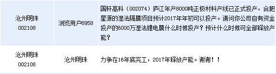 滄州明珠(002108)周二在全景網互動平臺上表示,公司6000萬濕法鋰電膜項目力爭在16年底完工,2017年釋放產能。