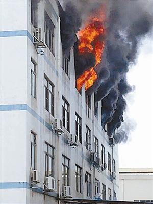 據(jù)現(xiàn)場一名工人介紹,昨日下午1點(diǎn)20分左右,他們正在宿舍午睡,一名起床上洗手間的同事突然看到,距離宿舍僅不到8米的工房4樓燃起了大火。“太恐怖了,當(dāng)時火很大,我們快被嚇?biāo)懒恕!痹摴と苏f,黑濃煙不斷從窗戶沖向天空,形成了黑色的蘑菇云,而起火的廠房4樓幾乎與他們所住的宿舍平行,大火不停地向宿舍蔓延,并將他們走道外晾曬的衣服全部燒毀,宿舍樓外墻也被燒得漆黑一片。大家被驚醒后迅速逃出宿舍樓下,有的工人甚至爬山到后面的一棟宿舍樓內(nèi)。