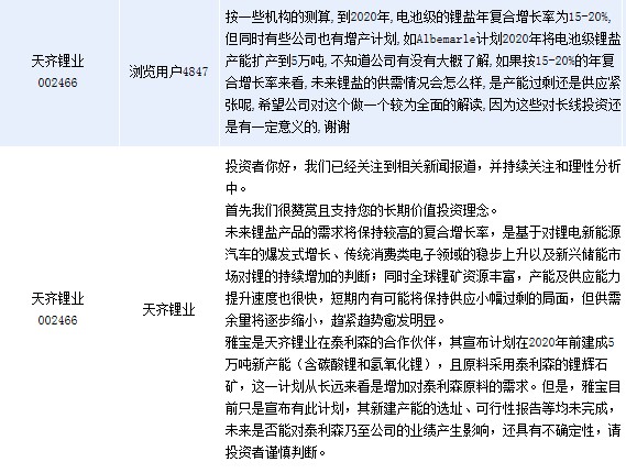 周一天齊鋰業(yè)(002466)在全景網(wǎng)互動(dòng)平臺(tái)上表示,未來(lái)鋰鹽產(chǎn)品的需求將保持較高的復(fù)合增長(zhǎng)率,是基于對(duì)鋰電新能源汽車的爆發(fā)式增長(zhǎng)、傳統(tǒng)消費(fèi)類電子領(lǐng)域的穩(wěn)步上升以及新興儲(chǔ)能市場(chǎng)對(duì)鋰的持續(xù)增加的判斷;同時(shí)全球鋰礦資源豐富,產(chǎn)能及供應(yīng)能力提升速度也很快,短期內(nèi)有可能將保持供應(yīng)小幅過(guò)剩的局面,但供需余量將逐步縮小,趨緊趨勢(shì)愈發(fā)明顯。