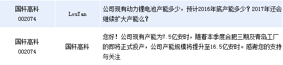 國軒高科(002074)周四在全景網互動平臺上表示,公司動力鋰電池現有產能為7.5億安時,隨著本季度合肥三期及青島工廠的即將正式投產,公司產能規模將提升至16.5億安時。