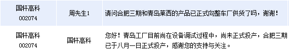 國軒高科(002074)周四在全景網互動平臺上表示,公司動力鋰電池現有產能為7.5億安時,隨著本季度合肥三期及青島工廠的即將正式投產,公司產能規模將提升至16.5億安時。國軒高科還表示,青島工廠目前尚在設備調試過程中,尚未正式投產,合肥三期已于八月一日正式投產。