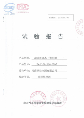 10月,河南鋰動電源有限公司生產(chǎn)的貧液態(tài)、軟包裝、疊片式動力軟包電池,在經(jīng)過各項(xiàng)破壞性測試后,安全性能優(yōu)秀,成功獲取北方汽車質(zhì)量監(jiān)督檢驗(yàn)鑒定試驗(yàn)所發(fā)放的160h及180Ah動力用鋰離子