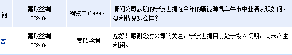 嘉欣絲綢(002404)周五在全景網互動平臺表示,子公司寧波世捷新能源科技有限公司目前處于投入初期,尚未產生利潤。