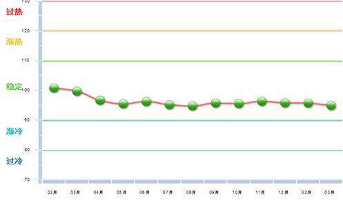 3月份中輕景氣指數(shù)為94.96,比上月下降0.85,位于“穩(wěn)定”區(qū)域(參見圖1-1)。