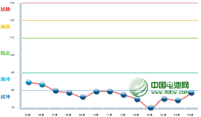 2012年7月以來,中輕電池景氣指數(shù)持續(xù)在 “過冷”區(qū)運(yùn)行。2012年7月至2013年6月指數(shù)在“過冷”區(qū)連續(xù)運(yùn)行一年,2013年3月份中輕電池景氣指數(shù)為68.56,創(chuàng)建立以來新低,之后開始有所回升,6月達(dá)78.52。