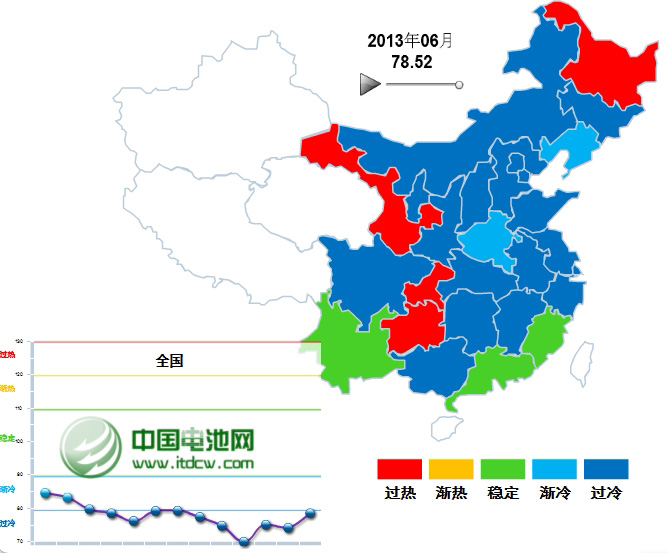 2013年6月中輕電池景氣指數(shù)為78.52,繼續(xù)停留在“過冷”提示區(qū),較3月的68.56有較大提升。其中:電池出口景氣指數(shù)為74.06,較5月的57.43有較大提高;電池資產(chǎn)景氣指數(shù)為87.48,基本平穩(wěn);電池利潤景氣指數(shù)為58.57,比5月的52.19,有所回升。