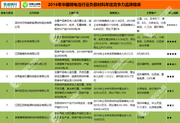 2016年中國鋰電池行業負極材料年度競爭力品牌榜單