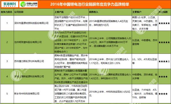 2016年中國鋰電池行業隔膜年度競爭力品牌榜單