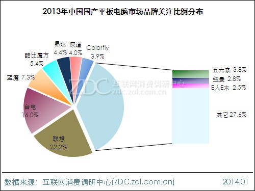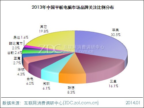 2013年1-4季度中國(guó)平板電腦市場(chǎng)品牌關(guān)注前十名