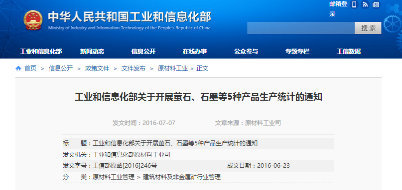 工信部關于開展螢石及石墨等5種產品生產統計的通知
