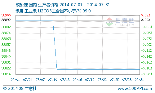 7月國(guó)內(nèi)工業(yè)級(jí)碳酸鋰行情僅在中上旬小幅下行,月初價(jià)為月高價(jià)38893元/噸,月末價(jià)為月低價(jià)38821元/噸,月跌幅為0.18%,當(dāng)前價(jià)格同比去年下降了6.93%。...