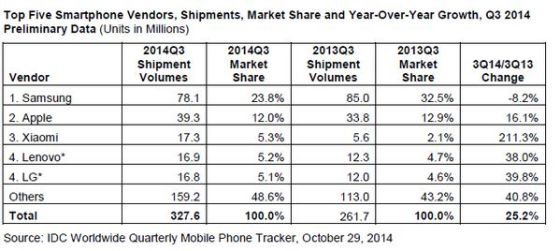全球智能手機出貨量超3億部 小米躍居第三