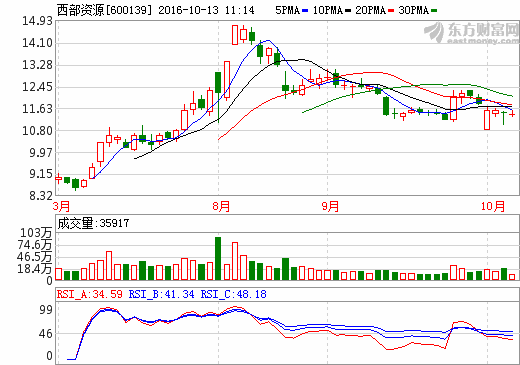 10月12日,西部資源開盤后低開早盤一度下挫跌至4.68%,截至收盤報收11.45元/股,跌幅0.87%。...