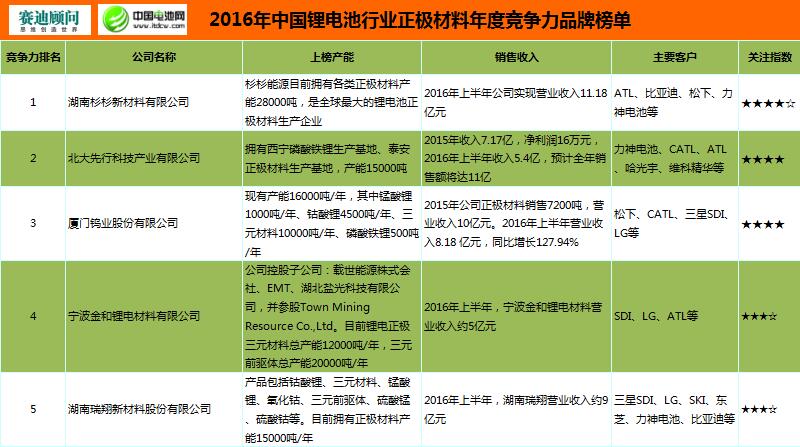 2016年中國鋰電池正極材料年度競爭力品牌榜單