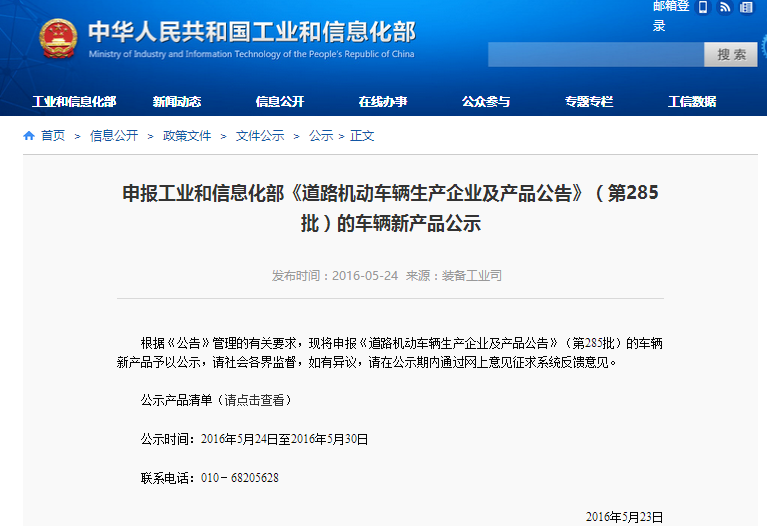 申報工業和信息化部《道路機動車輛生產企業及產品公告》(第285批)的車輛新產